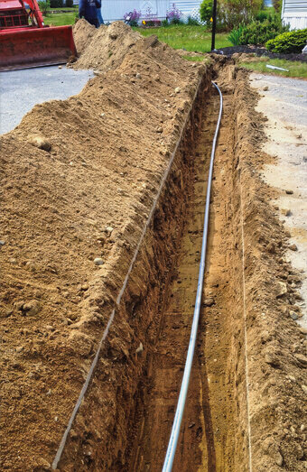Compliant trenching services and installation of electrical-grade conduit for underground mains, including proper backfill, warning tape, and compaction.